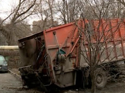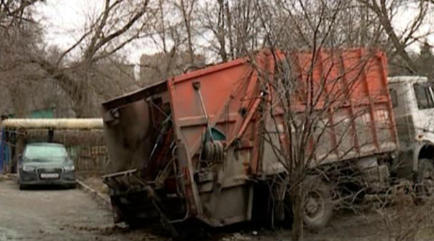 В Рязани во дворе жилого дома мусоровоз провалился колесом в землю