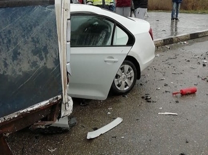 На Ейском шоссе в Краснодаре Skoda Rapid залетела под маршрутку, пострадали трое