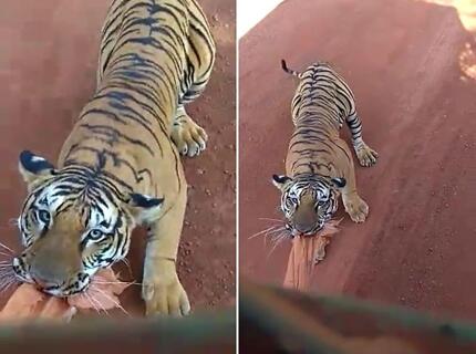 Упрямый тигр попытался отгрызть облицовку у сафари-мобиля в Индии