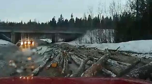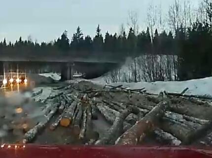 В Кирове упавшие с лесовоза бревна чуть не задавили легковой автомобиль