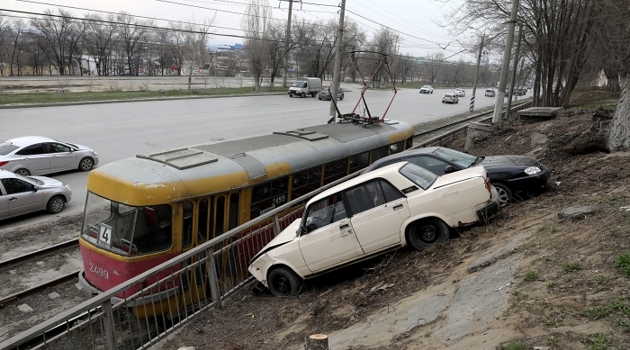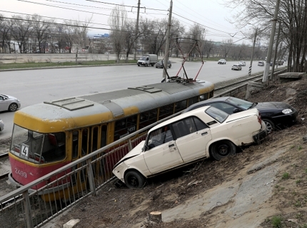 «Киа» и ВАЗ зависли над трамвайными путями в Волгограде