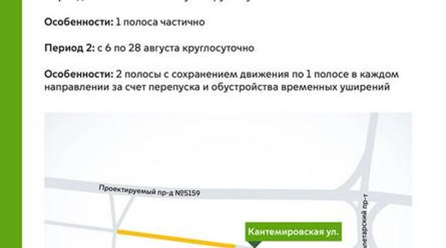 Движение по участку Кантемировской улицы ограничат с 31 июля по 28 августа из-за реконструкции