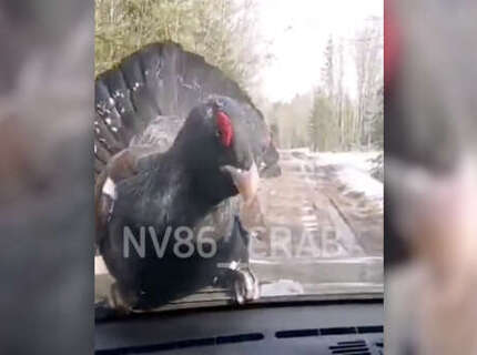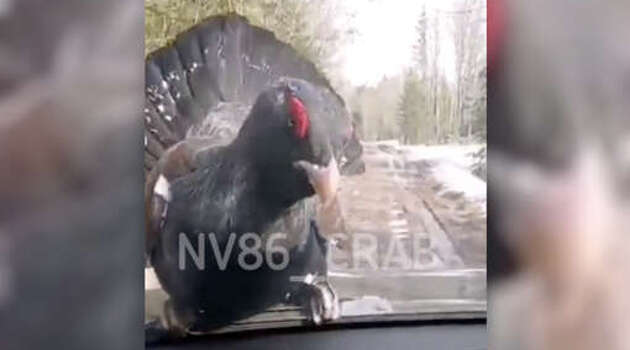 В Югре глухарь атаковал автомобиль во время поездки по лесу
