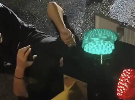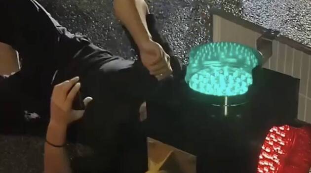 Самокатчик врезался в светофор, застрял в нем головой и попал на видео