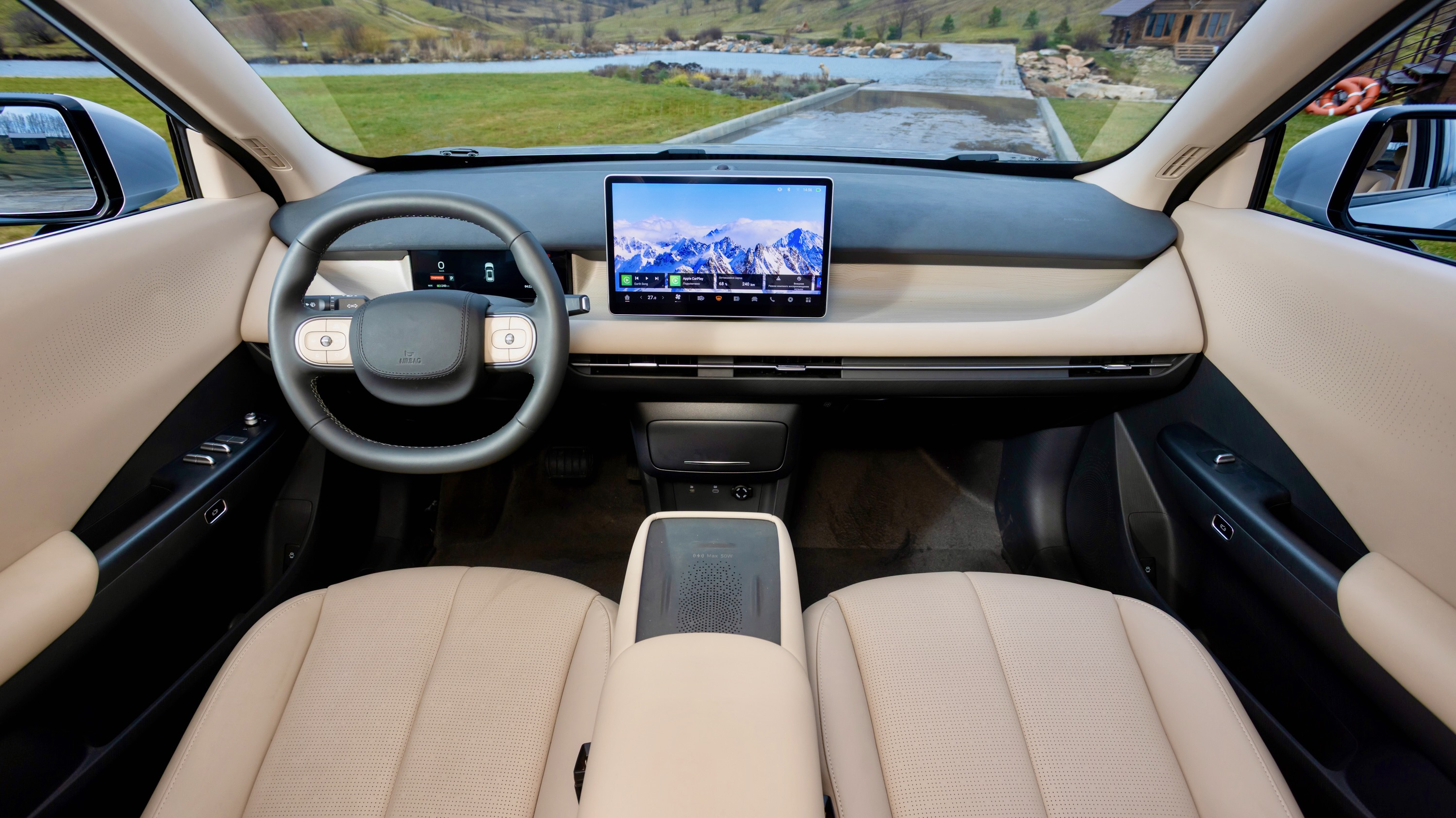 Но вернёмся за руль. Посадка за рулём — специфичная. Места, как я писал ранее, много, но сиденье очень уж короткое. Да ещё и спинка спрофилирована не лучшим образом, с еле выраженной боковой поддержкой. Главный минус — регулировка руля только по высоте. Найти удобное положение для хорошего хвата не так-то просто. Зато обзорность шикарная: стойки достаточно тонкие, лобовое стекло высокое и широкое, а боковые зеркала весьма крупные для электромобиля.