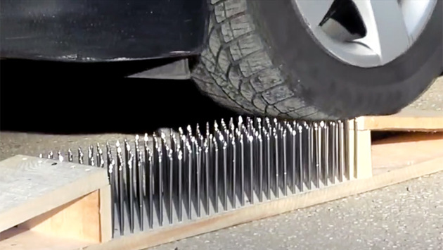 Помидоры, тюбики и апельсины пали под колесами немецкого автомобиля, и каждый из предметов по-своему отреагировал на силу шин. Напоследок шины испытали с помощью 300 гвоздей.