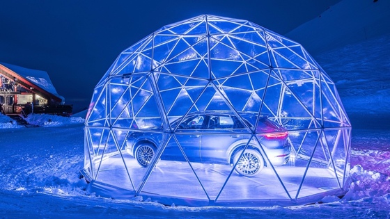 Компания Porsche открыла самый высокогорный «поп-ап стор» (временную торговую площадку) на вершине склона во французской коммуне Валь д'Изер. Он находится на уровне 2300 метров над уровнем моря рядом с рестораном ROK в горнлыжном курорте Мерибель. Торговая площадка представляет собой подиум со стеклянным куполом, выполненным в виде кристалла. Общий вес конструкции — более трех тонн. Внутри выставлен Porsche Cayenne последнего поколения. Для установки магазина Porsche понадобилась помощь вертолетов и снегоходов. В Porsche отмечают, что конструкция магазина выдержала натиск урагана «Элеанор» с порывами ветра скорость до 170 километров в час, мощнейшие снегопады и понижение температуры до минус 25 градусов Цельсия. Porsche Cayenne третьего поколения представили на автосалоне во Франкфурте осенью прошлого года. Модель переехала на новую платформу и впервые в истории получила полноуправляемое шасси. Помимо этого, внедорожник укомплектовали активными стабилизаторами поперечной устойчивости, питающимися от 48-вольтовой энергосети. Гамма двигателем нового Porsche Cayenne состоит и 3.0 V6 мощностью 340 лошадиных сил (340 Нм) и 2,9-литровой «турбошестерки», отдача которой составляет 440 сил и 550 Нм крутящего момента. Оба агрегата сочетаются с восьмидиапазонной автоматической трансмиссией. В России внедорожник стоит от 4 999 000 рублей.