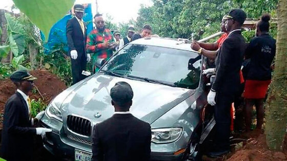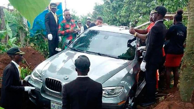 Житель Нигерии решил необычно похоронить родного отца - в шикарном внедорожнике за 5,5 млн рублей. Нигериец Азубуике похоронил своего отца в специально купленном для этих целей новом внедорожнике BMW вместо гроба на деревенском кладбище, пишет Daily Mail. По словам местных жителей, когда-то мужчина пообещал отцу купить шикарную машину, но не успел. Поэтому богатый сын решил купить дорогой внедорожник за 66 тыс. фунтов стерлингов (5,5 млн рублей) в местном автосалоне и почтил память родителя таким необычным образом. Фотография с церемонии прощания быстро набрала популярность в социальных сетях. Пользователи признались, что впервые видели, чтобы кого-то хоронили в дорогом автомобиле. Однако нашли и те, кто высказался против экстравагантной идеи купить умершему транспортное средство. По их мнению, деньгами можно было распорядиться куда лучше.