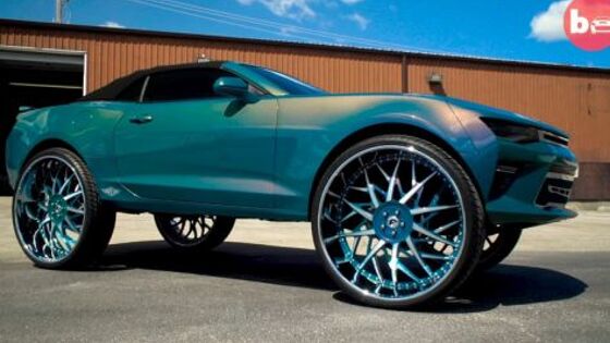 Один из владельцев кабриолета Chevrole Camaro имеет очень много денег и очень странные вкусы. Многие водители устанавливают на свои машины большие диски, но не многим для этого требуется менять всю подвеску и расширять колесные арки. Владелец поставил на свою машину диски диаметром в целых 32 дюйма, сделанные компанией Forgiato на заказ. Причем это были не самые огромные диски, сделанные фирмой за время ее работы. Автомобиль значительно утерял в управляемости и комфорте посадки, но вот ощущения при езде явно стали лучше. Но судя по дальнейшим модификациям, такой странности было недостаточно, так что хозяин машины покрыл ее хамелеоновой пленкой, которая комбинирует фиолетовый, салатовый и бирюзовый цвета. А фары конструировались с нуля и выполнены из мощных светодиодов. Все это делалось для того, чтобы при помощи смартфона можно было управлять цветом оптики. Кроме того, в салоне установлены плазменные телевизоры в дверях, а сам салон обшит кожей. Для того, чтобы после таких манипуляций двери можно было открывать, в них установили электроприводы. К головному устройству машины и ее телевизорам подключен Xbox One.
