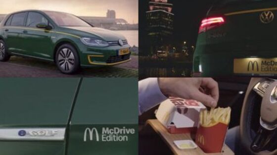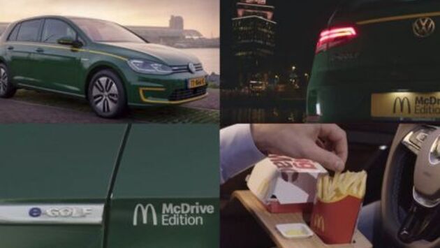 Он создан на основе хэтчбека Volkswagen e-Golf. Машина пока сделана в единственном экземпляре и получила название Volkswagen e-Golf - McDrive Edition. Внутри автомобиля продумано все, чтобы сделать удобным и приятным процесс приема пищи. Так, в дверном пространстве есть выдвижные полочки, куда можно положить бургер, картофель фри, соус. В бардачке скрыт подогреваемый отсек с перчатками. На центральной торпеде находится углубление для стакана с функцией охлаждения. В процессе приема трапезы легко настроить определенный звуковой фон. Это могут быть любимая музыка или шум из ресторана McDonald's. В салоне присутствуют кожаные элементы, представленные разными оттенками. На подголовниках сидений и рулевом колесе можно встретить логотип McDonald's. В техническом плане машина изменений не претерпела. Автомобиль приводится в движение от электромотора на 100 кВт и мощностью в 136 лошадиных сил. Одной зарядки аккумуляторов хватает на 300 километров.