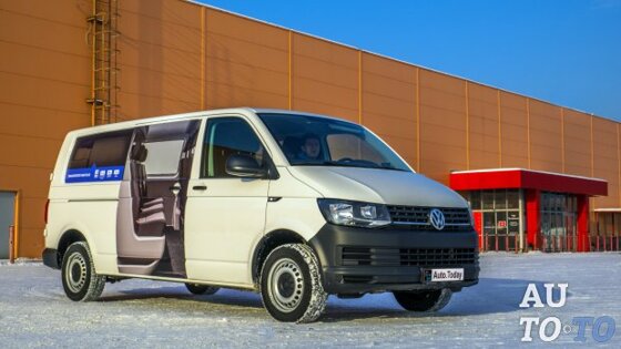 Volkswagen Transporter – это самый распространенный микроавтобус на украинских дорогах. Шесть поколений немецкого «труженика» бегают и выполняют миллион различных функций и задач – от санитарных автомобилей, и до чартеров гостиниц. Поэтому знакомство с длиннобазным многофункциональным вариантом вызывало во всей редакции неподдельный интерес. Модель за 65 лет выпуска нашла очень много поклонников по всему земному шару. Шестое поколение, на первый взгляд, мало отличается от предшественника, но внутри произошло достаточно изменений, чтобы называться новой генерацией. Что же изменилось больше всего, и в каком направлении движется эволюция «Транспортера»? Акцентировать внимание Дизайнеры больше всего видоизменили фронтальную часть Volkswagen Transporter, установив новую головную оптику, а также передние крылья и бампер с «острыми» подштамповками. Фары головного света в нашей комплектации галогенные. Штампованные 16-дюймовые колесные диски обуты в высокопрофильную резину – только практичность, никакой ненужной модности. Лобовое стекло всегда остается чистым благодаря почти идеальной траектории работы стеклоочистителей и наличию подогрева форсунок омывателя. Боковые зеркала – большие по площади, и также имеют подогрев. Вообще, их нужно очень сильно ценить и научиться считывать с них всю информацию. Ведь при перестроении, или маневрировании задом они – ваш единственный источник информации о ситуации за автомобилем. В качестве опции можно установить камеру заднего вида. От нее я бы точно не советовал отказываться при формировании своей комплектации. Тестовый микроавтобус имеет пластиковые неокрашенные бамперы и решетку радиатора, также серые вставки-колпачки в колесные диски. Они немного дробят общий образ автомобиля (особенно в светлом цвете), но все же их утилитарная миссия выше. Мягкий качественный пластик позволяет не бояться даже мелкого контакта с какими-то препятствиями, не говоря уже о толстых ветках и прочих прутиках. Наш «Транспортер» имеет удлиненную колесную базу в 3,4 метра. Передняя половина авто отделена на пассажирский отсек в 6 мест, задняя часть – грузовая. Автомобиль имеет 5 дверей – пара передних, одна боковая сдвижная и две створки сзади. Кстати, в зависимости от целей, можно выбрать заднюю дверь цельную – глухую, или со стеклом. Легковой вариант Несмотря на 100-процентное коммерческое предназначение тестового автомобиля, внутреннее убранство микроавтобуса максимально приближено к легковому автомобилю. Так, рулевое колесо, хоть и не снабжено клавишами управления, но по форме почти полностью повторяет бюджетные модификации легковых «Фольксвагенов». Оно, кстати, снабжено регулировкой угла наклона. Материалы отделки преимущественно жесткие и демократичные, но все панели качественные и очень цепко закреплены. В большую нишу можно спрятать аптечку, или мелкие сумки. Откинув спинку вперед, можно положить пару ящиков. Отдельно регулируется угол наклона спинки только у водительского кресла. У пассажиров регулировка общая. Как и полагается автомобилю, нацеленному на работу в службах доставки и других сервисах, под рукой у водителя и передних пассажиров более десятка ниш для всевозможных документов, мобильных телефонов и пр. Их суммарный объем превышает 100 литров. На торпедо также разместилась пара подстаканников. Щ