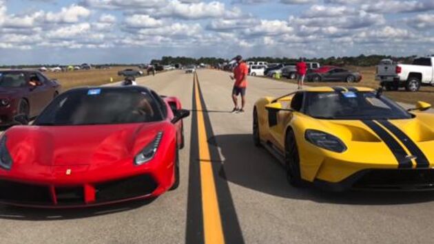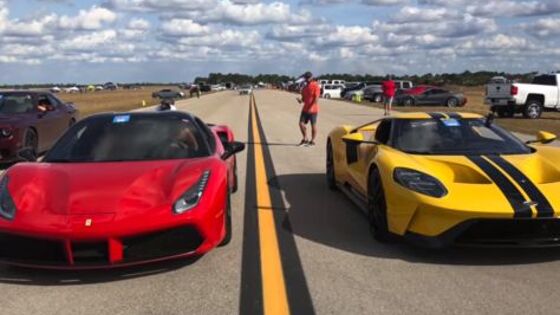 На бумаге Ford GT и Ferrari 488 достаточно равны по характеристикам, но посмотрим, как они выступят в гонке на скорость. Команда DragTimes отправляется на соревнование по драг-рейсингу Wannagofast в Иммокали, штат Флорида и приводит свой Ford GT. Этот ролик воссоздает классическую гонку между Ford и Ferrari, сопоставляя друг против друга GT и 488 Spider. Пара суперкаров довольно близка по своим характеристикам. Ford GT комплектуется 3,5-литровым V6 с двойным турбонаддувом, вырабатывающим 647 лошадиных сил (482 киловатта) и 745 Нм крутящего момента с семиступенчатой коробкой передач с двойным сцеплением. Ferrari 488 Spider с 3,9-литровым V8 с двумя турбонаддувами, мощностью 661 л.с. (493 кВт) и 760 Нм и Ferrari также имеет семиступенчатую коробку передач с двойным сцеплением. Не говоря о финале, Ford GT довольно тяжело стартует, по сравнению с оппонентом. Позже в этом ролике был показан лучший пробег GT за день. Суперкар преодолел 400-метровую дистанцию со скоростью 214,2 км/ч и со скоростью 261 км/ч при пересечении отметки в 800 метров. Заводская максимальная скорость Ford составляет 347,6 км/ч, поэтому для достижения максимальной скорости купе потребуется гораздо большее расстояние.