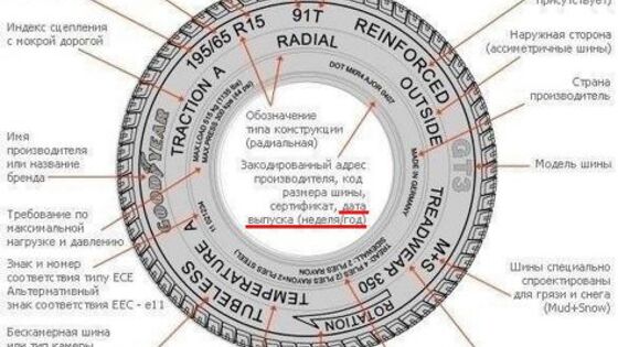 От правильности применения покрышки в автомобиле зависит очень многое, в том числе и безопасность. Поэтому каждая шина тщательно маркируется, изготовитель стремится указать на ней все необходимые сведения, позволяющие исключить ошибки при установке на конкретный автомобиль. Размер шины. Геометрические размеры занимают первое место в маркируемых данных. Обычно это три главных числа в формате xxx/yy/Rz: -первое трёхзначное число xxx означает ширину профиля шины в миллиметрах, важный параметр, определяющий площадь зоны контакта шины с дорогой, а также грузоподъёмность колеса; -затем через знак дроби идёт величина, равная отношению высоты профиля к ширине, выраженному в процентах; буква R имеется практически в каждой маркировке, поскольку она означает радиальное расположение нитей корда в покрышке, а применявшееся ранее диагональное сейчас почти нигде не используется, разве что в шинах для спецтехники; -последнее число z соответствует посадочному диаметру колёсного диска, на который может быть установлена данная шина. В зависимости от этих указанных параметров, шина может быть широкопрофильной, когда первое число составляет от 200 до 300-350 миллиметров, при этом относительная высота профиля, измеряемая от посадочного места на диске до уровня протектора, находится в пределах 25-55 процентов. Такая резина хорошо работает на сухом ровном асфальте, позволяя точно управлять автомобилем на высоких скоростях. Более высокопрофильные покрышки проявляют себя на пересечённой местности, эффективно гася удары от неровностей, при этом не повреждаясь от пробивания шины до окраин диска. Используются на автомобилях повышенной проходимости. Спортивные шины могут иметь перед буквой R дополнительное обозначение в виде буквы Z, значит такое колесо может выдерживать эксплуатацию на спорткарах, где скорости достигают 250 км/ч и более. Подобные покрышки смогут надёжно цепляться за асфальт при запредельных для обычных автомобилей скоростях, однако потребуют ровного и гладкого покрытия. Подбор шин по автомобилю. Исходная информация содержится в прилагаемой к машине документации. Там же указаны и допустимые отклонения в размерах. Но при творческом подходе к выбору резины надо всё же соблюдать ряд ограничений: -нельзя превышать положенную ширину и внешний диаметр покрышки, при максимальных ходах подвески она станет задевать за элементы кузова; -если потребуется сменить диск, установив деталь с отклонением по посадочному диаметру, то мало того, что резина должна точно соответствовать диску, но и сам диск обязан вместить в себя расположенные внутри тормозные механизмы; -слишком низкопрофильная резина не сможет правильно гасить все удары, перегружая детали подвески; излишне широкопрофильная шина может дать обратный эффект, не повысив управляемость, а наоборот, вызывая внезапно возникающие скольжения. Обычно небольшие отклонения по размеру вызываются сезонностью применения, для лета используются более широкие и низкие шины, зимой же полезно уменьшать площадь пятна контакта, одновременно увеличивая высоту и энергоёмкость пневматики колеса. Ошибки в определении скорости. Любые изменения размеров повлияют на правильность показаний спидометра. Он рассчитан под строго определённый диаметр колеса, это надо учитывать при монтаже нестандартной резины