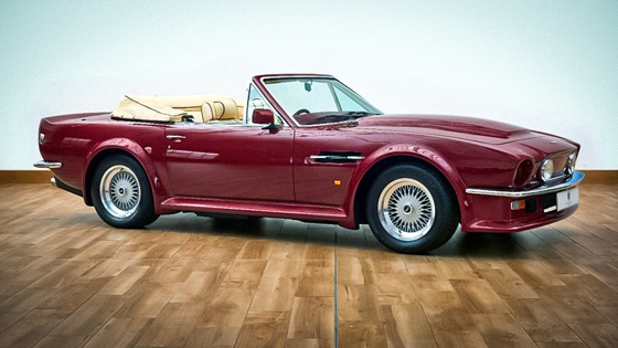 Aston Martin в бордовом цвете кузова с бежевым кожаным салоном был изготовлен в 1988 году. Он приводится в движение 5,3-литровым V8 мощностью 428 л.с. – мотор разгоняет кабриолет до первой "сотни" за 5,2 сек., а максимальная скорость составляет 270 км/ч.