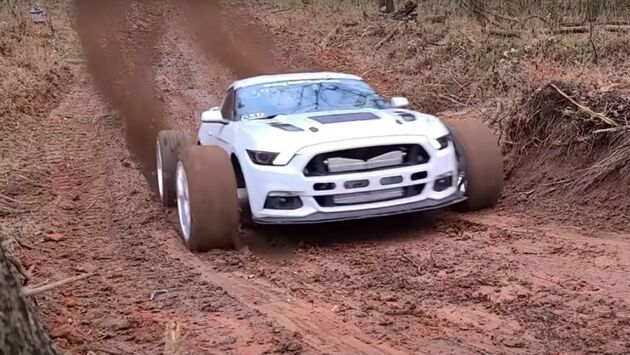 Хотя Ford Mustang совершенно не подходит для внедорожных вылазок, этот экземпляр был модифицирован специально для этого. Самое заметное изменение — это другие шины, которые установлены крайне необычным способом. Вместо того чтобы применить лифт подвески и сохранить ту же ширину колеи, владелец решил просто удлинить оси и полностью вынести колеса из колесных арок.
