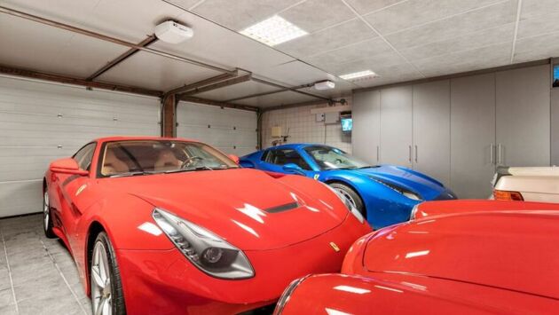 Внутри находится сразу 4 автомобиля, которые, судя по всему, влезли сюда с трудом. Среди них два Ferrari — F12berlinetta, и 488 Spider, и два классических родстера Mercedes-Benz — 190SL ярко-красного цвета и бежевый R107.