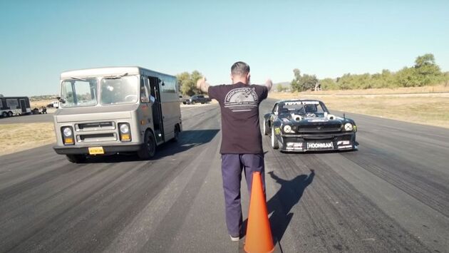 Кастомный «Мустанг» под названием Hoonicorn, принадлежащий известному экстремалу Кену Блоку, весит всего 1360 килограммов. При этом он оснащен наддувным V8 мощностью 1400 лошадиных сил в тандеме с полным приводом. На его фоне соперник выглядит совсем «по-детски»: фургон Chevrolet P10 имеет 420-сильный восьмицилиндровый двигатель серии LS, работающий в паре с четырехдиапазонным «автоматом» и задним приводом. Этот 52-летний автомобиль используется компанией Hoonigan для перевозки официальной промо-продукции, поэтому в свое время он был изрядно модифицирован. В частности, был усилен тем самым мотором LS.