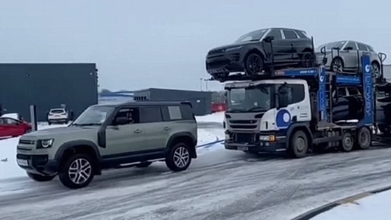 Британский дилер Swansway Land Rover из Стаффорда поделился необычным видеороликом, который демонстрирует буксировочные возможности нового Defender. Внедорожник вытянул в обледенелую гору 40-тонную фуру Scania P410, загруженную семью новыми Land Rover.
