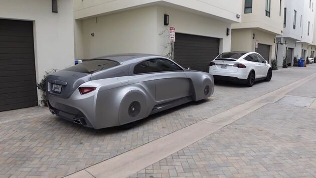 Первое, что бросается в глаза — необычные боковины, за которыми полностью спрятаны колеса. Чтобы реализовать такую задумку, тюнерам пришлось разработать накладные боковины и надеть их на купе. А чтобы они не стесняли движение колес, их сделали довольно выпирающими от основного кузова. В итоге визуально машина стала заметно шире. И, глядя на нее, создается впечатление, что автомобиль будто парит в воздухе без какой-либо точки опоры.