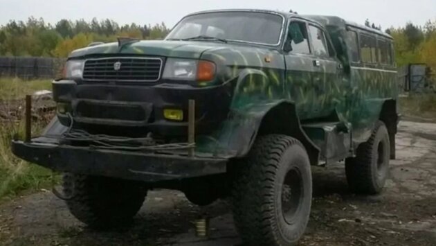Перед нами брутальный внедорожник, в облике которого явно улавливаются черты “Волги” (ГАЗ-31029). Задняя часть автомобиля без сомнений является кузовом УАЗ-452. Но от кого у данного вездехода шасси? Тут также особо гадать не нужно. Это ГАЗ-66.