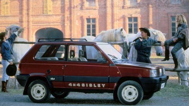 FIAT Panda 4x4 Sisley. На рынке Италии этот автомобиль считается легендой. Выпускался он в конце 1980-х годов. Не все жители Апеннин положительно оценивают квадратные и четко обозначенные линии кузова. Но есть армия энтузиастов, которые действительно ценят этот компактный автомобиль. К слову, его габариты составляют 340.8*149.4*142 см. Вес транспорта всего 800 кг, а под капотом трудится литровый мотор. Этот агрегат способен развивать всего 44 л.с., но даже этого достаточно для преодоления бездорожья. В оснащении предусматриваются миниатюрные колеса, которые способны пробираться в разные дебри. Автомобиль не боится грязи, песка или воды, даже несмотря на то, что его клиренс составляет всего 13 см. Быстро разогнаться по асфальтовой дороге не получится. Максимальная скорость, которую может развивать авто, останавливается на отметке 130 км/ч. Первую сотню миниатюрный внедорожник набирает всего за 16 секунд.