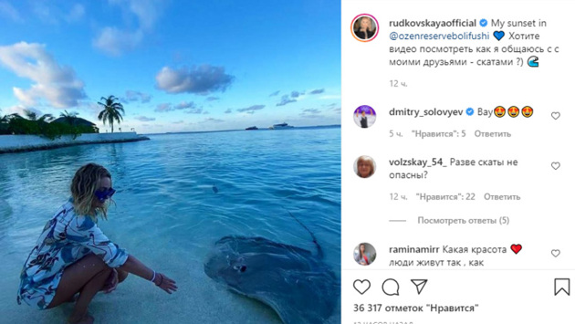 «Общаюсь с моими друзьями — скатами», — написала Рудковская под фото с опасной рыбой. Знаменитость спросила своих подписчиков, хотели бы они посмотреть видео, на котором она сидит рядом со скатами.