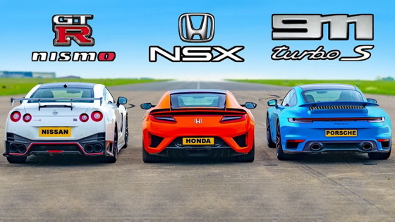 YouTube-канал carwow устроил дрэг-гонку между Honda NSX, Nissan GT-R Nismo и Porsche 911 Turbo S в кузове 992. Три двухдверки объединяет схожая мощность, полный привод и цена. По традиции, сильнейшего выявили, устроив пару заездов с места на четверть мили, пару гонок с хода с 50 миль в час (80 километров в час) на дистанциях в полмили и милю, а финальным тестом была оценка эффективности тормозов со скорости 70 миль в час (113 километров в час).