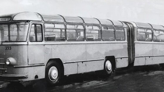 На этой фотографии показана модель автобуса, сочлененного из двух, его хотели построить в пятидесятых годах прошлого века. В то время не было надежных механизмов, применимых для середины конструкции транспортного средства. Позднее подобная компоновка станет использоваться немецкими инженерами. К тому же, вряд ли советский мотор ЗИЛ-158Л справился бы с такой конструкцией автобуса.