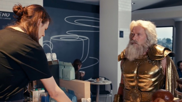 В рекламной ролике бариста в кофейне пытается выговорить имя покупателя, который заказал «макиато». Не справившись с надписью на стаканчике, продавец обращает свой взор на клиента, которым оказывается Арнольд Шварцнеггер, буквально, искрящийся молниями. Во время диалога киноактер заявляет, что он древнегреческий бог Зевс. После чего, бросив грозный взгляд на бариста, забирает свой напиток и покидает кофейню. Учитывая, что Зевс олицетворяет собой гром и молнии, новая реклама BMW точно посвящена электромобилю.