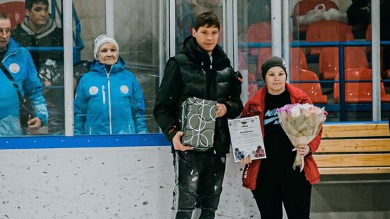 Наталья Стус получила благодарственное письмо и подарок, а также приняла участие в символическом вбрасывании шайбы перед матчем «Бирюсы» с командой «Торнадо».