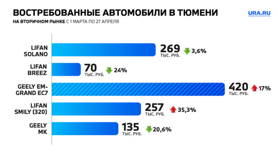 Самым популярным китайским автомобилем с пробегом стал Lifan Solano. Средняя стоимость на данную модель в период с 1 марта по 27 апреля стала ниже на 3,6% и составила 269 тысяч рублей. Следом по популярности идет Lifan Breez (520) со средней ценой 70 тысяч рублей. Стоимость автомобиля упала почти на 24%. Спрос на китайский автомобиль Geely Emgrand EC7 стал чуть ниже, при этом цена выросла почти на 17%. Автомобиль стал стоить значительно дороже, чем его предшественники по популярности у тюменцев — 420 тысяч рублей. Средняя стоимость китайской машины Lifan Smily (320) составляет 257 тысяч рублей. Цена стала выше на два месяца на 35,3%. Автомобиль Geely MK занял последнее место по спросу у тюменцев. Его средняя стоимость упала на 20,6% и составила 135 тысяч рублей.