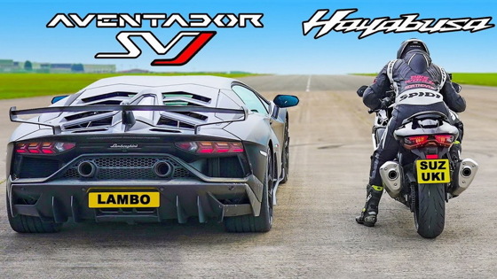 Британский YouTube-канал carwow устроил дрэг-гонку между новейшим гипербайком Suzuki Hayabusa и купе Lamborghini Aventador SVJ. Дуэль между японским спортивным мотоциклом и итальянским суперкаром включала в себя старты с места на четверть мили, параллельные гонки с хода с 50 миль в час (80 километров в час) на полмили, а финальным испытанием была оценка эффективности тормозных механизмов со 100 миль в час (161 километр в час).