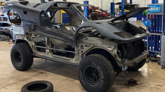 В качестве донора взяли обычный Jeep Liberty первого поколения, всю верхнюю часть кузова которого срезали для установки нового. Крыши и стоек нет, как и всех кузовных панелей, которые можно было снять.