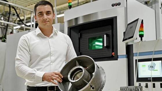 Руководитель группы аддитивного производства Центра аддитивных технологий (ЦАТ) Ростеха Михаил Жеребцов берет в руки элемент турбинной установки. Эта деталь используется в наземном двигателе энергетической установки. Круглая полая форма с перегородками внутри напоминает авиационный двигатель. Эта деталь изготовлена с помощью аддитивных технологий.