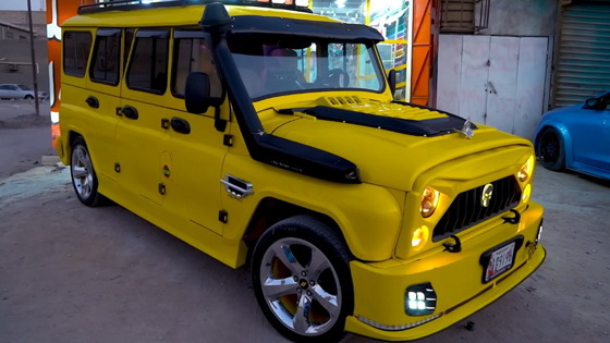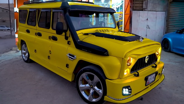 YouTube-блогер Mohammad Tawfik снял видеообзор безумного семидверного лимузина УАЗ, сделанного... в Ираке! Местный автолюбитель превратил старенький УАЗ-3151/Hunter в шоу-кар с удлинённой рамой, развитым пластиковым обвесом и трехрядным салоном. По центру внедорожника врезали отдельную секцию с парой дверей, в салоне установили дополнительный ряд сидений, переваренный кузов покрасили кислотно-жёлтой эмалью, а переобули УАЗ в кичливые легкосплавные диски.
