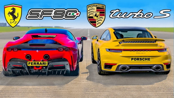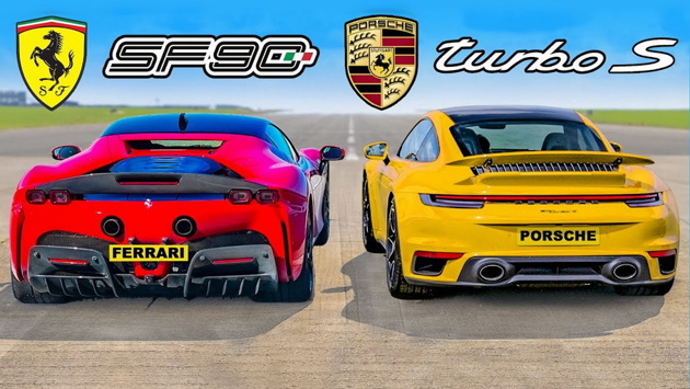 Британский YouTube-канал carwow устроил дрэг-гонку между быстрейшей серийной Ferrari — супергибридом SF90 Stradale — и Porsche 911 Turbo S серии 992. Победителя определили по итогам серии заездов с места на четверть мили, стартов с хода 50 миль в час (80 километров в час) на полмили, а финальным испытанием была оценка эффективности тормозных механизмов при замедлении со 100 миль в час (161 километр в час) до полной остановки.