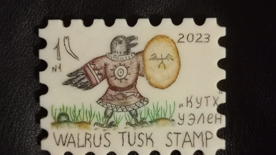 На необычной марке они изобразили знаменитого героя из преданий народов Чукотки и воплощение духа ворона - Кутх, а также сделали надпись «WALRUS TUSK STAMP», что в переводе с английского языка означает «марка из бивня моржа».