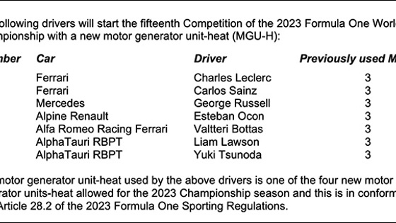 Перед началом первой пятничной тренировки в FIA подтвердили замену элементов силовых установок на семи машинах. Шарль Леклер, Карлос Сайнс, Джордж Расселл, Эстебан Окон, Валттери Боттас, Лиам Лоусон и Юки Цунода получили новые двигатели внутреннего сгорания, турбины, MGU-H и MGU-К (не все), и новые выхлопные системы. Все замены в рамках регламента, никто оштрафован не будет.