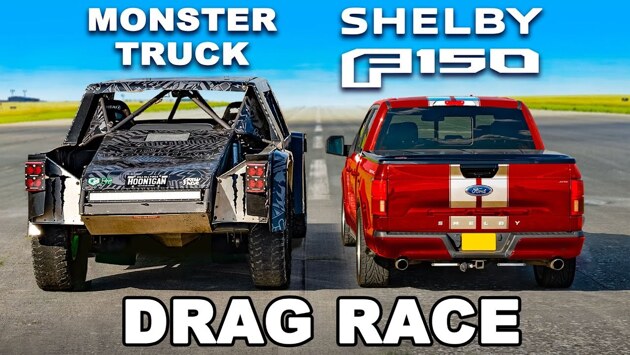 В теории пикапы абсолютно не предназначены для гонок, но на практике существуют даже кольцевые гоночные серии для пикапов. Подготовленный для специфических заездов монстр-трак из общего с пикапом имеет и вовсе только характерный кузов, но это не помешало блогерам с YouTube-канала Carwow свести его в заезде с суперпикапом Ford F-150, доработанным прославленным ателье Shelby в фирменное «заряженное» исполнение Super Snake.