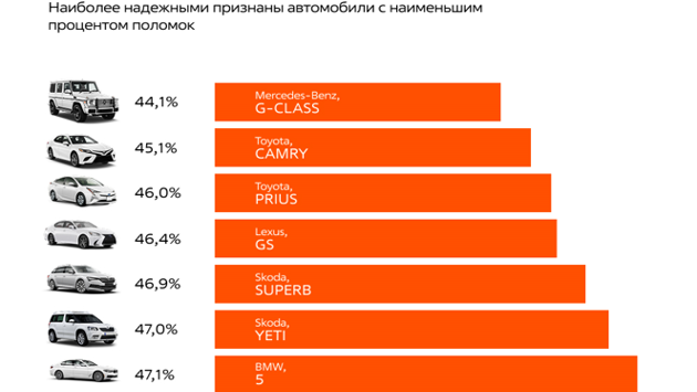 Абсолютным лидером рейтинга по моделям авто стал Mercedes-Benz G-Class. Доля поломок у немецкого внедорожника самая низкая - 44,1%. На втором месте по надежности находится Toyota Camry с показателем 45,1%. Третью позицию занимает японский гибридный легковой автомобиль Toyota Prius (46%). Далее модели расположились с минимальным отличием в доле поломок: Lexus GS (46,4%) и Skoda Superb (46,9%). Интересно, что в топ-10 попало три представителя шведской марки Skoda, три модели немецких концернов и четыре японских автомобиля.