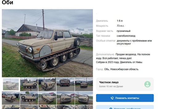 Техника собрана в 2023 году и, по словам продавца, полностью на ходу: работает двигатель, трансмиссия и отопитель. Посадочная формула - 1+1. Документов на машину нет, но автор проекта подчеркивает, что вездеход отлично подходит для передвижения по труднодоступной местности, в том числе по болотам и лесам.