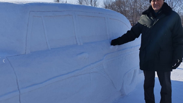 В конце прошлого года, к завершению года 85-летия Победы, он построил на своем участке точную снежную копию танка Т-34-85 в полную величину. А этой зимой, по совету своего внука-пятиклассника Никиты, мастер взялся за новую масштабную тему — «Автомобиль эпохи».