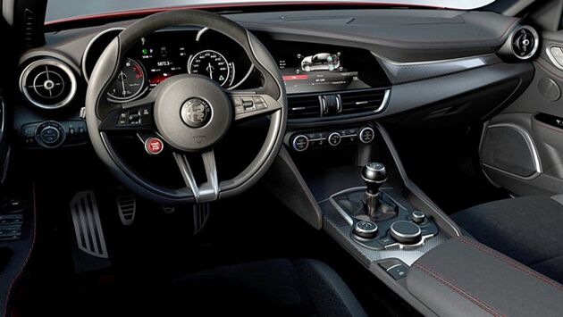 В распоряжении нидерландского издания De Telegaaf оказалась официальная фотография салона седана Giulia, являющегося идеологическим преемником модели 159. На снимке показан интерьер «заряженной» версии Quadrifoglio Verde (QV), которая составит конкуренцию BMW M3. На фото видно рулевое колесо с эмблемой итальянской марки и кнопкой «старт-стоп», селектор шестиступенчатой механической коробки передач, обтянутая кожей передняя панель с карбоновыми вставками, а также «шайба» управления мультимедийной системой и кнопка электронного стояночного тормоза.