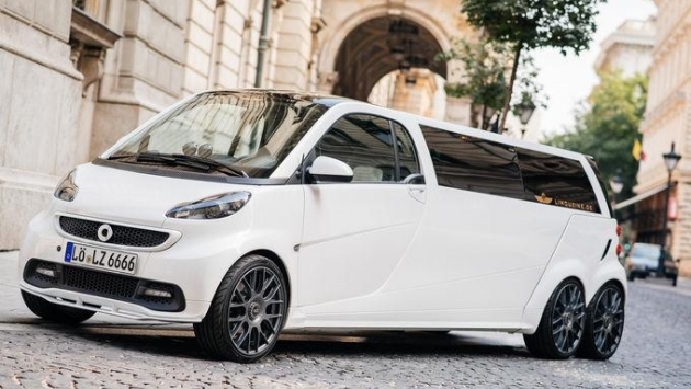 Немецкая фирма Limouzine. de представит на выставке во Франкфурте шестиколесный лимузин, построенный на базе Smart ForTwo. Новинка, которая получила название Madeforsix, вмещает шесть человек: водителя и пять пассажиров. Габаритная длина автомобиля выросла с 2,69 метра до 5,5, пишет Motor.ru. Конструкторы добавили третью ось сзади, центральную открывающуюся вверх дверь для доступа пассажиров в салон и 18-дюймовые колесные диски. О технической начинке пока известно лишь то, что лимузин приводит в движение 120-сильный двигатель. Остальные подробности Limouzine. de раскроет во время премьеры.