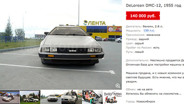 Три объявления о продаже DeLorean DMC-12 появились 21 октября на автомобильном портале drom.ru. Легендарную машину времени из фильма «Назад в будущее» предложил купить жителям Новосибирска, Владивостока и Краснодара пользователь под псевдонимом Dr E. Brown Enterprises. Согласно описанию, леворульное транспортное средство имеет двигатель объемом 2,8 литра мощностью 150 лошадиных сил. В каждом из объявлений год выпуска автомобиля отличается — 1955, 1985 и 2015. Стоимость варьируется от 140 до 230 тысяч рублей. При этом, как отмечается, «оборудование для полетов в будущее демонтировано, цена на него обсуждается отдельно». Позже автор объявлений сообщил: «Машина продана. Она улетела в недалекое и светлое будущее. Новый хозяин обещал обязательно вернуться». Продажа автомобиля оказалась шуткой создателей сайта. Розыгрыш приурочен к знаменательной дате, 21 октября, дню прибытия главного героя американской фантастической трилогии «Назад в будущее» Марти Макфлая из 1985 в 2015 год. Во время своих приключений главный герой также побывал в 1955-м и в 1885 годах. Сам актер Майкл Джей Фокс, сыгравший главную роль в фильме режиссера Роберта Земекиса, заявил в июле этого года, что согласится сесть за руль автомобиля DeLorean «только за большие деньги». По его словам, DeLorean — худшая машина в мире. Фокс отметил, что конструкция автомобиля очень неудобна из-за чего он постоянно получал травмы. «Я ударялся головой о дверь и бился рукой о потоковый накопитель», — жаловался актер. Первый фильм трилогии «Назад в будущее» вышел в прокат в 1985 году. В центре сюжета — подросток Марти Макфлай, путешествующий во времени с другом, профессором Брауном. В 1989 и 1990 годах на экранах появились вторая и третья части истории. DeLorean DMC-12 — спортивный автомобиль, который выпускался в Северной Ирландии для американской автомобильной компании DeLorean Motor Company с 1981 по 1983 год. В модели DMC-12 были использованы двери типа «крыло чайки», которые открываются вверх. Еще одной отличительной особенностью машины был рамный кузов из композита, оклеенный снаружи листами неокрашенной нержавеющей стали.