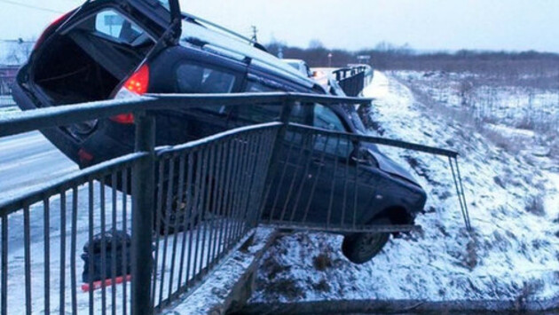 Под Петербургом Lada протаранила ограждение и зависла над обрывом