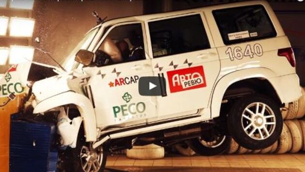 Конечно, УАЗ Патриот. рамный внедорожник. Вес машины около двух тонн и на высоких колесах, что на дороге дает моральное ощущение безопасности перед легковыми автомобилями. Но на самом деле это ошибочно. Используемая рама, взята со старого УАЗИКА, которую никто и ни когда не просчитывал на деформации при аварии. На заводе никогда не делали математическую модель и формулы кузова, подвески и рамы, что бы по формулам рассчитать поведение машины в разных условиях. И благодаря таким краш-тестам производитель принял решение с этого года использовать цифровую модель при проектирование следующего поколения внедорожника. А пока по результатам краш-теста выяснилось, что машина набирает всего лишь скромную одну звезду безопасности. При лобовом столкновение с блоком в левую сторону автомобиля, водитель получил серьезные повреждения. Манекен, исполнившей роль водителя, получил серьезные нагрузки на ноги и шейные позвонки. Это свидетельствует, что при столкновение ноги водителя практически наверняка будут сломаны. И шейные позвонки будут сильно травмированы несовместимые с жизнью или приведет к параличу. Но есть и положительные моменты. Теперь кузов не слетает с рамы, так как внесены изменения в крепление шасси к кузову сделаны отлично. Для пассажира такая авария не станет летальной. Добавленная подушка безопасности и натяжители ремня безопасности уберегут пассажира от серьезных травм. Тем самым, по сравнению с первыми поколениями Патриота от трех крестов, которые приговаривали кузов, пассажира и водителя, теперь остаются только крест на водителе. Надеемся, что машина следующего поколения, учтет все ошибки и УАЗ Патриот станет безопасным и комфортным внедорожником.