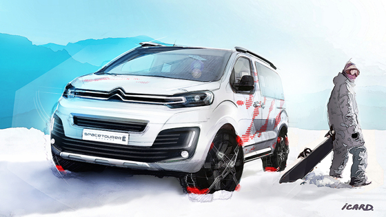 «Ситроен» представил концептуальный фургон, который получил имя SpaceTourer 4X4 Ë Concept. Новинка сделана в стилистике фирменных аксессуаров из коллекции «Ë» (буква взята из французского написания названия марки — Citroën), и в компании такой автомобиль называют «мечтой путешественника». Прототип построен на базе модификации фургона SpaceTourer с короткой колесной базой. По сравнению с серийным автомобилем дорожный просвет «Ё-концепта» увеличился на 60 миллиметров, появилась система подключаемого полного привода, разработанная совместно с французской компанией Automobiles Dangel, и установлен особый обвес кузова с защитными накладками, который должен придавать автомобилю вид внедорожника. Верхние части кресел и подголовники обшиты белой кожей, а остальные элементы отделаны серой алькантарой. Система трансформации салона позволяет оставить только четыре посадочных места в пассажирской части салона. В этом случае объем багажного отсека увеличивается до двух кубических метров. Новинка оснащена 150-сильным дизельным двигателем и шестиступенчатой механической коробкой передач. В оснащение прототипа вошел проекционный дисплей, камера заднего вида, адаптивный круиз-контроль, системы слежения за мертвыми зонами и дорожной разметкой, распознавания дорожных знаков, автоматического переключения дальнего света на ближний и предотвращения фронтальных столкновений. Публичный дебют «Ё-концепта» состоится на мартовском автосалоне в Женеве.