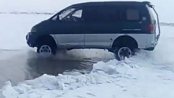 В Якутии рыбаки заехали на лед на микроавтобусе, а когда пытались вернуться обратно, обнаружили огромный разлом, через который машина, на первый взгляд, пройти не может. Чтобы не объезжать трещину, водитель решил, перепрыгнуть ее на полном ходу. Он высадил пассажиров, разогнался и «перепрыгнул» разлом.