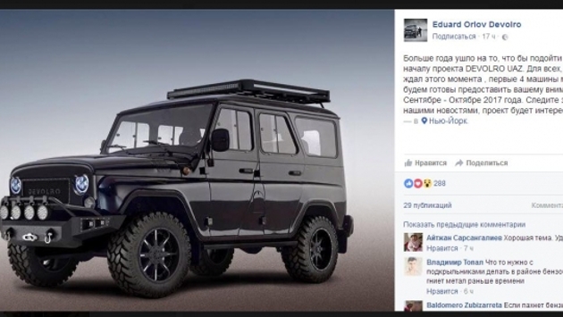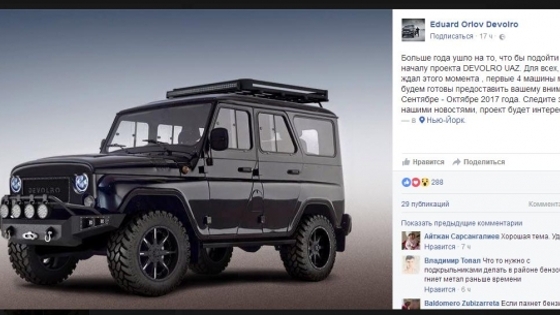 26 марта 2017 года о сроках выхода в свет доработанных УАЗов рассказал на своей странице в Facebook Эдуард Орлов, основатель ателье Devolro в Майами. По словам Эдуарда больше года ушло на то, чтобы приступить непосредственно к доработке этих автомобилей. В качестве сроков показа готовых моделей называются сентябрь-октябрь 2017 года. Доработке будут подвергнуты четыре авто от Ульяновского Автомобильного Завода. Год назад Эдуард Орлов сообщил, что готов к старту проекта с УАЗ Хантер и УАЗ Патриот. Но геополитическая обстановка и рост курса доллара не позволил реализовать начатое в ближайшие сроки. Кроме того, ожидалось, что у проекта будет крупный корпоративный заказчик. Это позволило бы дорабатывать авто для частных и разовых клиентов. Сейчас Devolro осуществляет тюнинг автомобилей Форд и Тойота. Работа с российскими автомобилями — новая строка в развитии компании. Ожидаемые цены на новую модель — от 1 миллиона рублей. Изменениям будет подвергнут силовой агрегат, детали подвески, экстерьера и интерьера. УАЗ Хантер, после выхода из тюнинг-ателье обретет новое имя — UAZDEVOLRO. Главным конкурентом этого автомобиля будет Гелендваген от Мерседес. Тем временем на самом УАЗе модернизируют производство, что должно улучшить качество и позволит сэкономить в 2017 году 9 миллионов рублей.